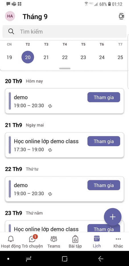 , kéo đến đúng ngày và giờ học, màn hình sẽ hiển thị như sau: